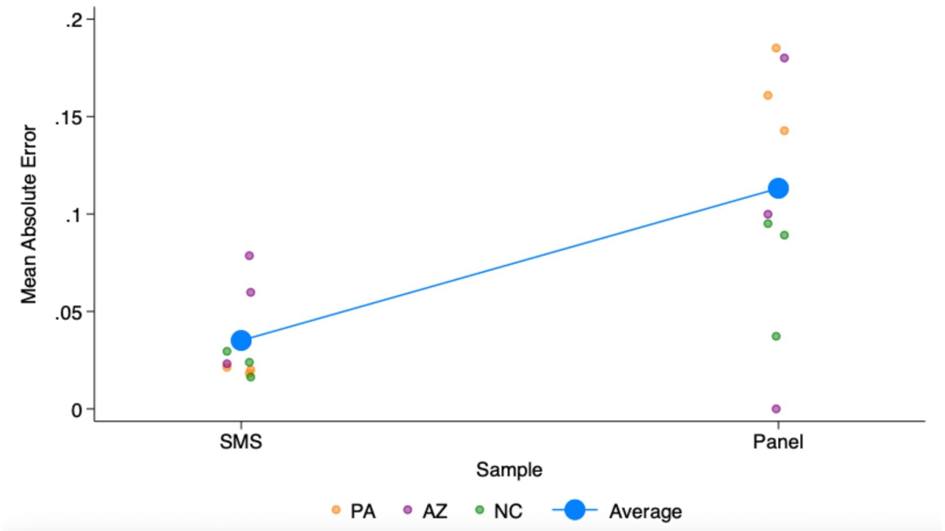 While not every contest estimate is more accurate in the text-to-web estimates than the panel estimates, we find that on average the SMS has lower absolute error and very close to exactly 0 bias. There’s also less variance in the accuracy of the estimates.