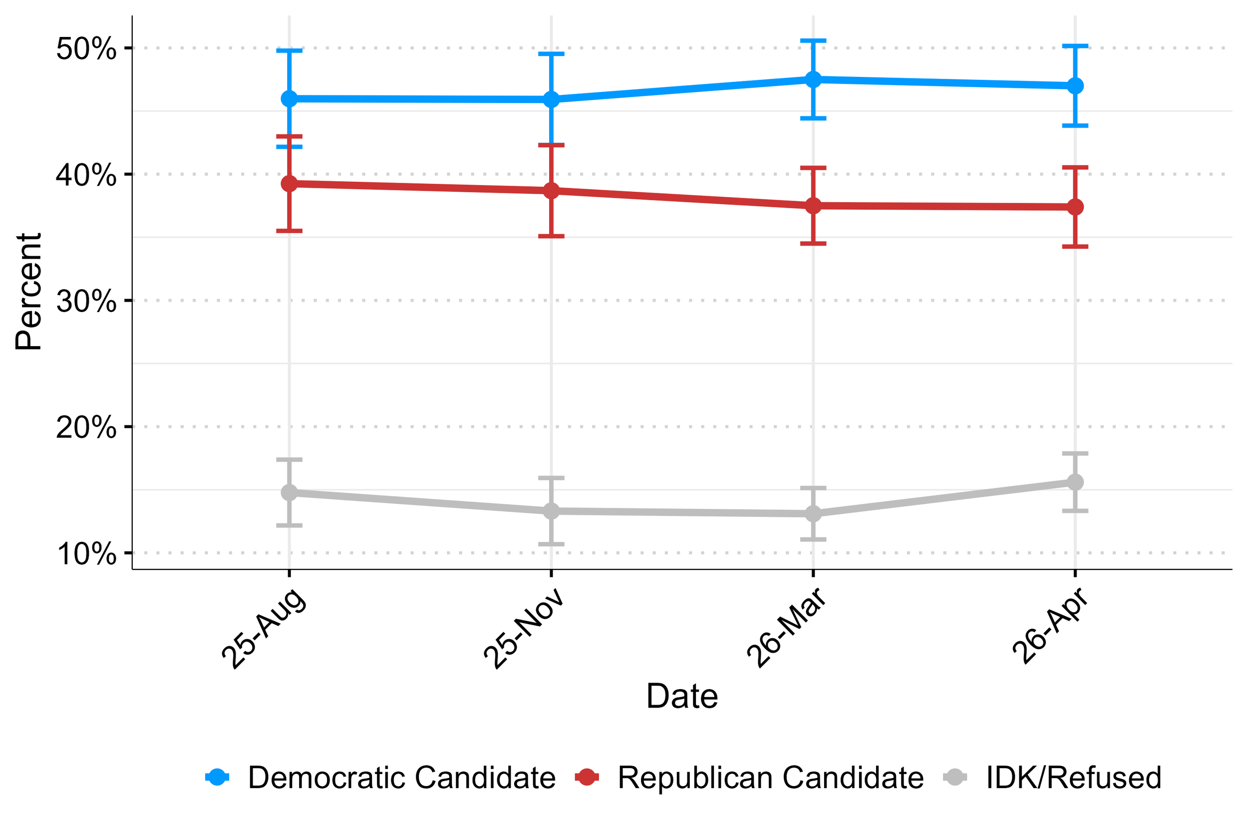 Looking at the crosstabs, the partisan lines remain firmly drawn: 94% of Democrats support the Democratic candidate, while 87% of Republicans support the Republican candidate. Support among independent voters also remains largely stable. In March, 53% of independents preferred Democratic candidates, 21% preferred Republican candidates, and 25% were undecided. By April, that stood at 51% for Democratic candidates and 22% for Republican candidates, with the remaining 27% undecided.