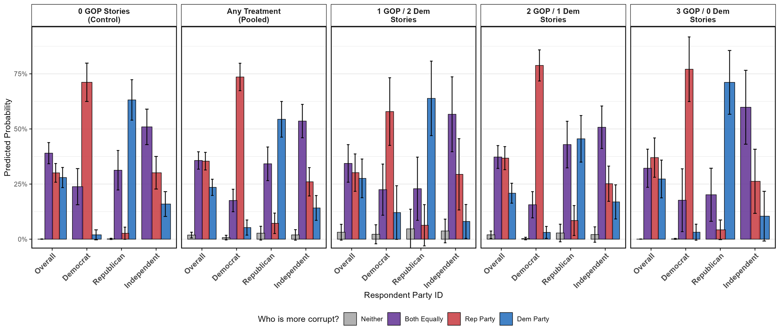 The full text of these vignettes is in the questionnaire at the bottom of the blog post. To measure the impact of these stories, half of our respondents (the control group) were asked our standard tracking question—"Who do you think is more corrupt?"—before evaluating the news stories. The other half (the treatment group) were asked the party corruption question after reading and evaluating their three randomly assigned stories.