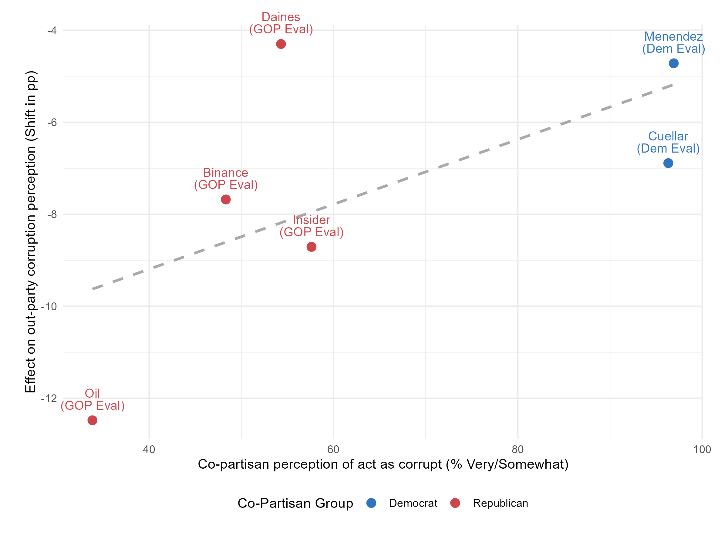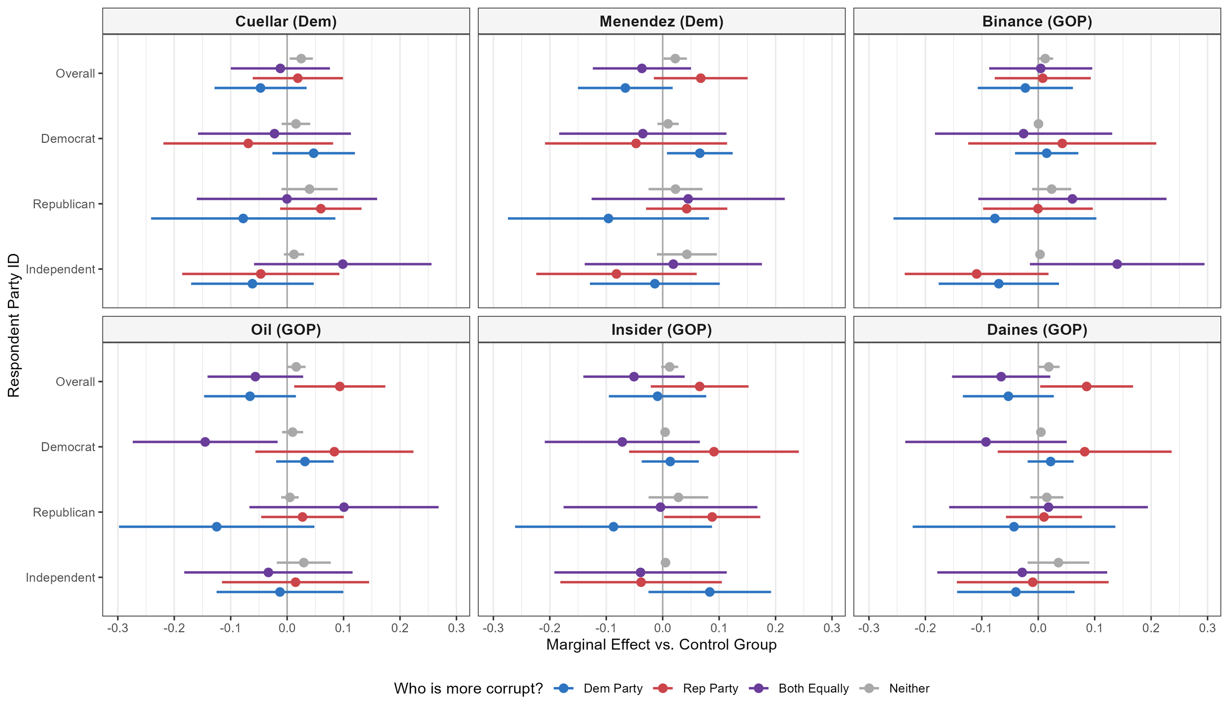 Looking at the effect of the Democratic stories on Democratic voters, we see that Democrats are persuadable when confronted with specific evidence against their own side. Exposure to the Bob Menendez bribery story clearly had a positive effect on co-partisan blame, significantly increasing the perception among Democrats that the Democratic Party is more corrupt by 6.6 percentage points (p<0.05). The Henry Cuellar indictment story similarly pushed Democrats to view their own party as more corrupt by 4.7 percentage points, though this shift was not statistically significant in this sample.