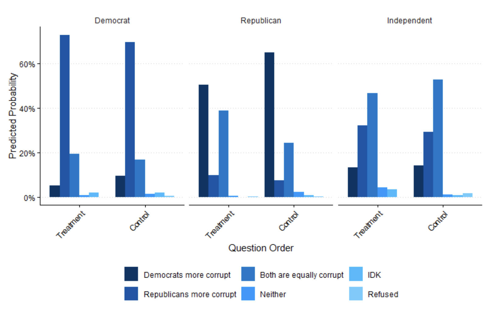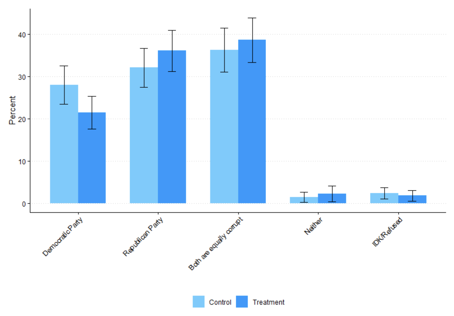 But these views are also malleable. We ran an experiment to test how much providing respondents information about one recent news story about corruption allegations against the Trump administration affected this view. Half of respondents (the treatment group) received a question with information about a recent news story before being asked about which party is more corrupt, while the other half (the control group) received the party corruption question first.