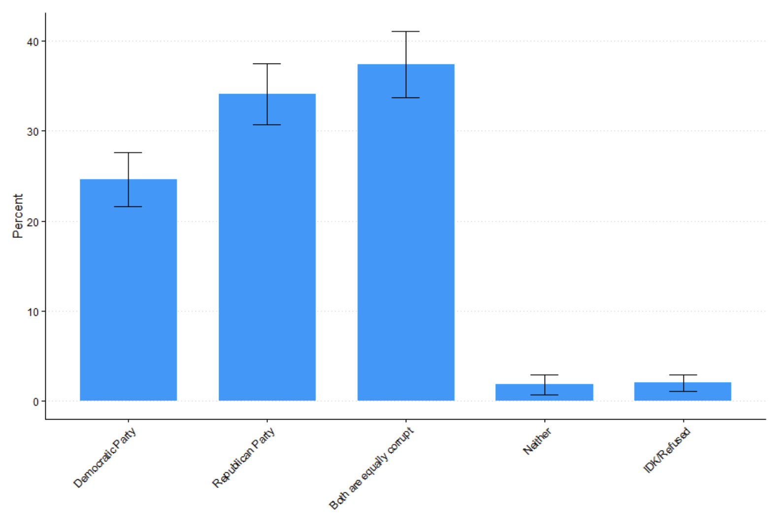 These topline results tell a familiar story. A plurality of Americans think both parties are equally corrupt, but of those who view one party as more corrupt, more view Republicans as the more corrupt party. This shows that while there is widespread cynicism about politics in general, partisanship still plays a role in perceptions of party corruption. Voters hold strong, and often sharply divided, opinions about which party they trust (or do not trust) to act with integrity. These baseline perceptions provide a starting point for our analysis, letting us see how Americans view party corruption on their own.