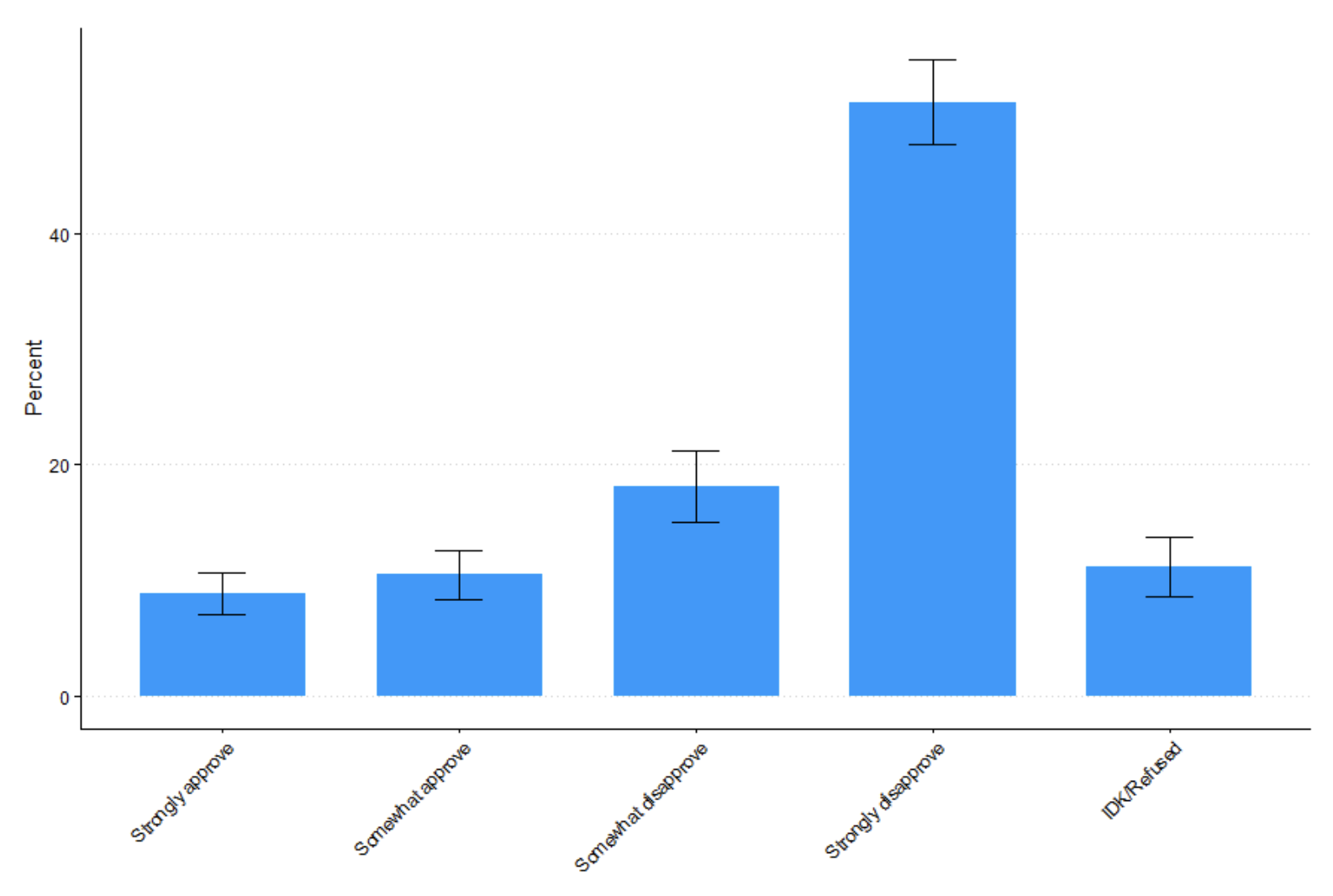 | Strongly disapprove | 51 | 80 | 14 | 59 | 60 | 50 | 62 | 54 | 55 | 45 | 48 | 54 | 80 | 54 | 50 | 60 | 48 | 49 | 53 | 47 | 55 | 53 | 48 | 87 | 11 | 61 | 54 |