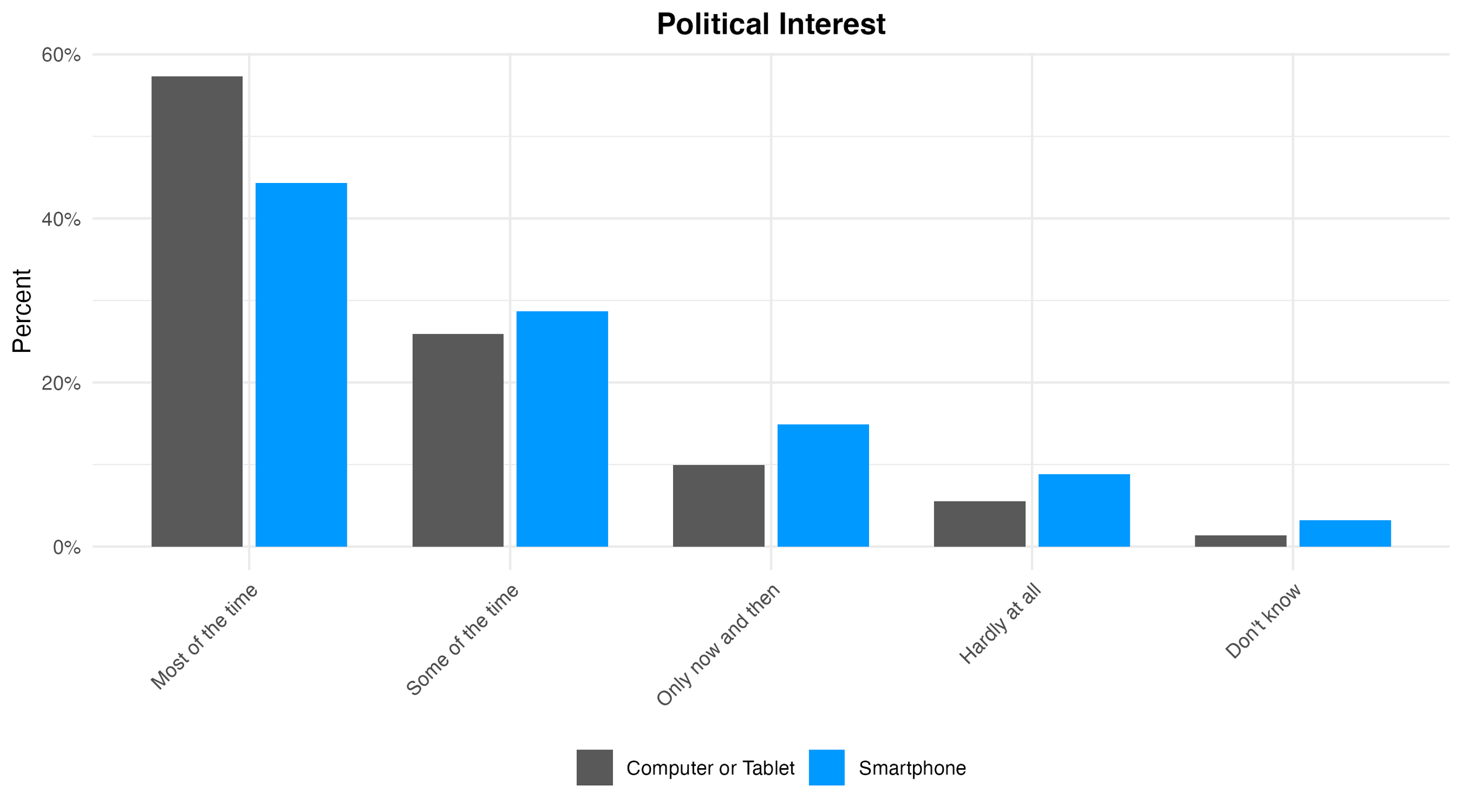 A majority of panel respondents answer on phones, and they make up a distinctive portion of the electorate. Yet the user experience on a 3x5 inch screen is inherently different from that on a laptop or desktop computer, and so it is important to make sure that the survey is designed for the interface that most – and the most hard to reach – respondents are using.